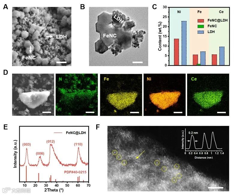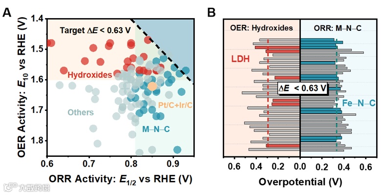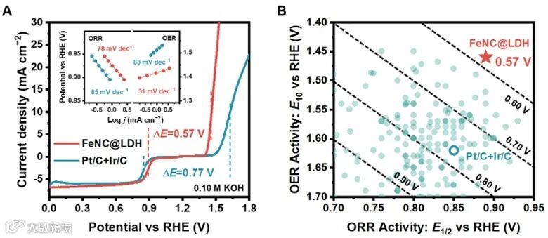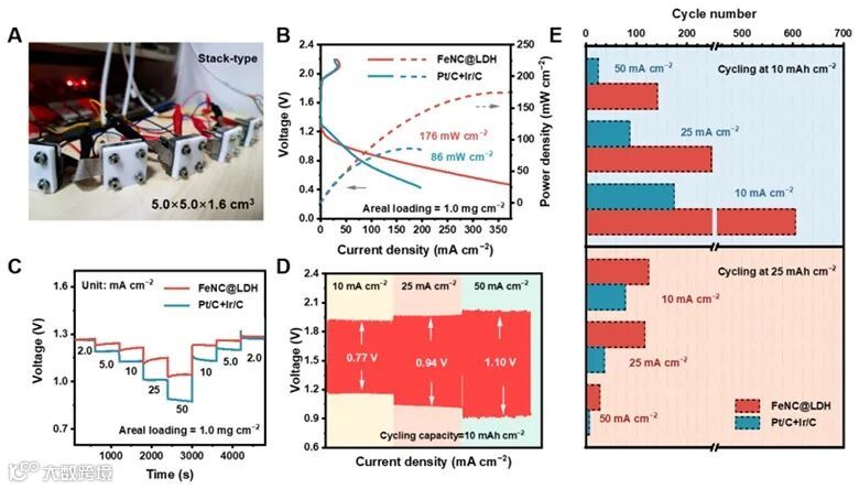 基于上述理性设计,复合FeNC@LDH催化剂具有极高的双功能催化活性,创纪录地实现了ΔE = 0.57 V(图3)。这一活性不仅超越了商用贵金属催化剂,同时打破了双功能催化活性尘封三年的记录。进一步地,基于FeNC@LDH催化正极的电池相比贵金属催化剂展现出更小的极化。此外,FeNC@LDH电池表现出更好的倍率性能、更小的充放电电压差和更高的能量效率,同时能够在10 mA cm−2和10 mAh cm−2的条件下循环607圈,在50 mA cm−2和25 mAh cm−2的条件下稳定循环(图4)。