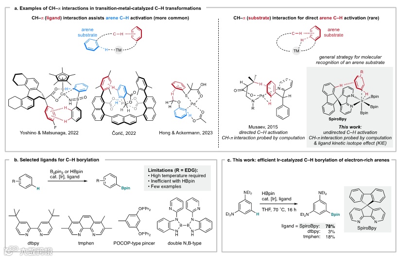 利用螺环二联吡啶配体SpiroBpy中芴环上的C–H键与底物芳环的 π 电子产生非共价相互作用,可以有效加速富电子芳环的碳氢键活化反应