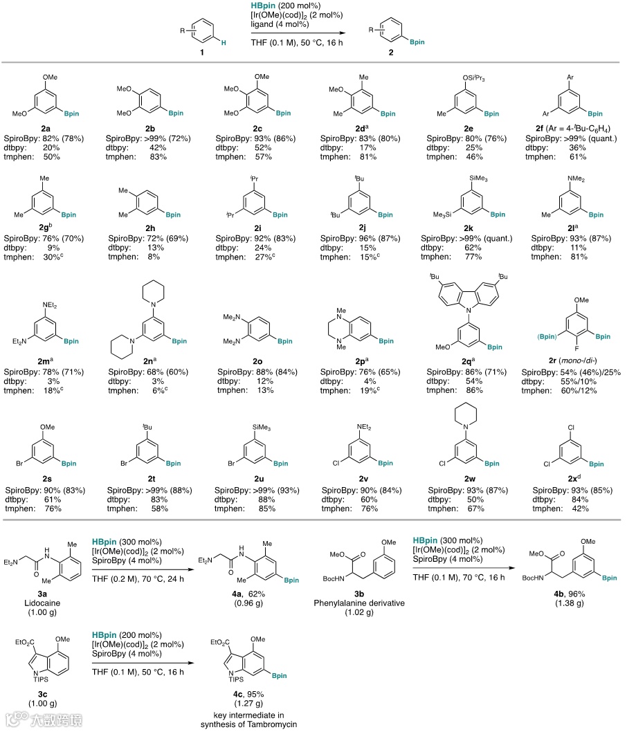 随后,作者利用SpiroBpy配体,在较温和的条件下,探讨了HBpin与各种芳环底物的碳氢硼化反应,并同常用的dtbpy和tmphen配体做了对比(图3)。作者主要测试了大量富电子芳环底物,发现SpiroBpy配体具有更好的普适性,无论是甲氧基、芳基、烷基、氨基等取代的芳环底物,均能以较高产率得到相应的芳基硼产物,而dtbpy和tmphen配体则无法在相同的温和条件下得到高产率(