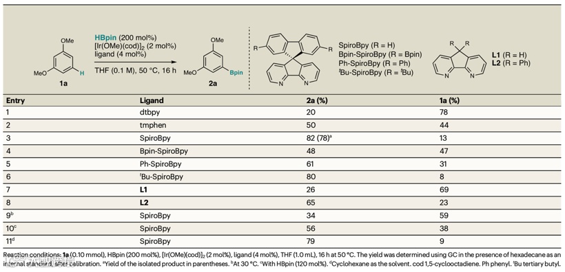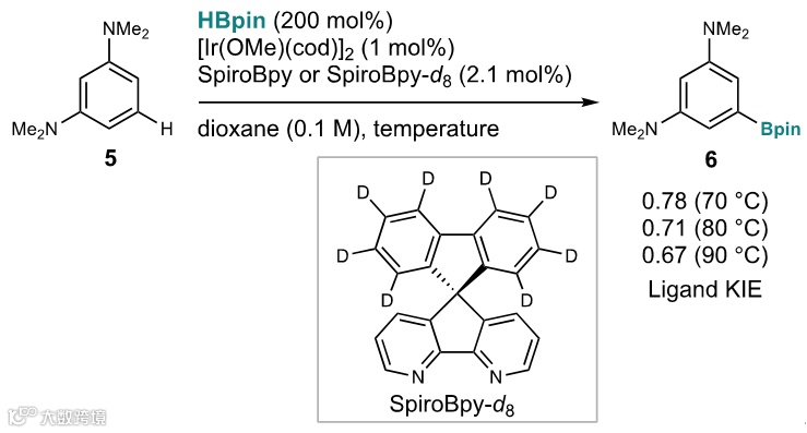 ,尤其是碳氢键活化步骤(图1a右灰色框)。利用SpiroBpy配体,可使富电子芳环底物在较温和条件下与低活性的HBpin进行反应,以较高产率得到芳基硼产物,而常用的叔丁基二联吡啶(dtbpy)和四甲基邻菲啰啉(tmphen)则无法实现高效转化(图1c)。同时,作者还通过密度泛函理论(DFT)计算以及实际合成氘代配体并进行动力学同位素效应(Ligand Kinetic Isotope Effect)实验的手法,验证了SpiroBpy配体结构中芴环上C–H键在反应过程中的参与。相关研究成果近期发表在