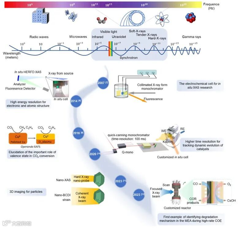 电催化剂的结构转变过程,并建立了相应的构效关系。其中,同步辐射技术由于其高亮度、高通量、优良的定向性、偏振性和高稳定性等优势,被公认为全面的表征平台。此外,不同波长的同步辐射光源,从红外到硬X射线,展示了在多尺度分辨率和多模式敏感性方面的独特优势。