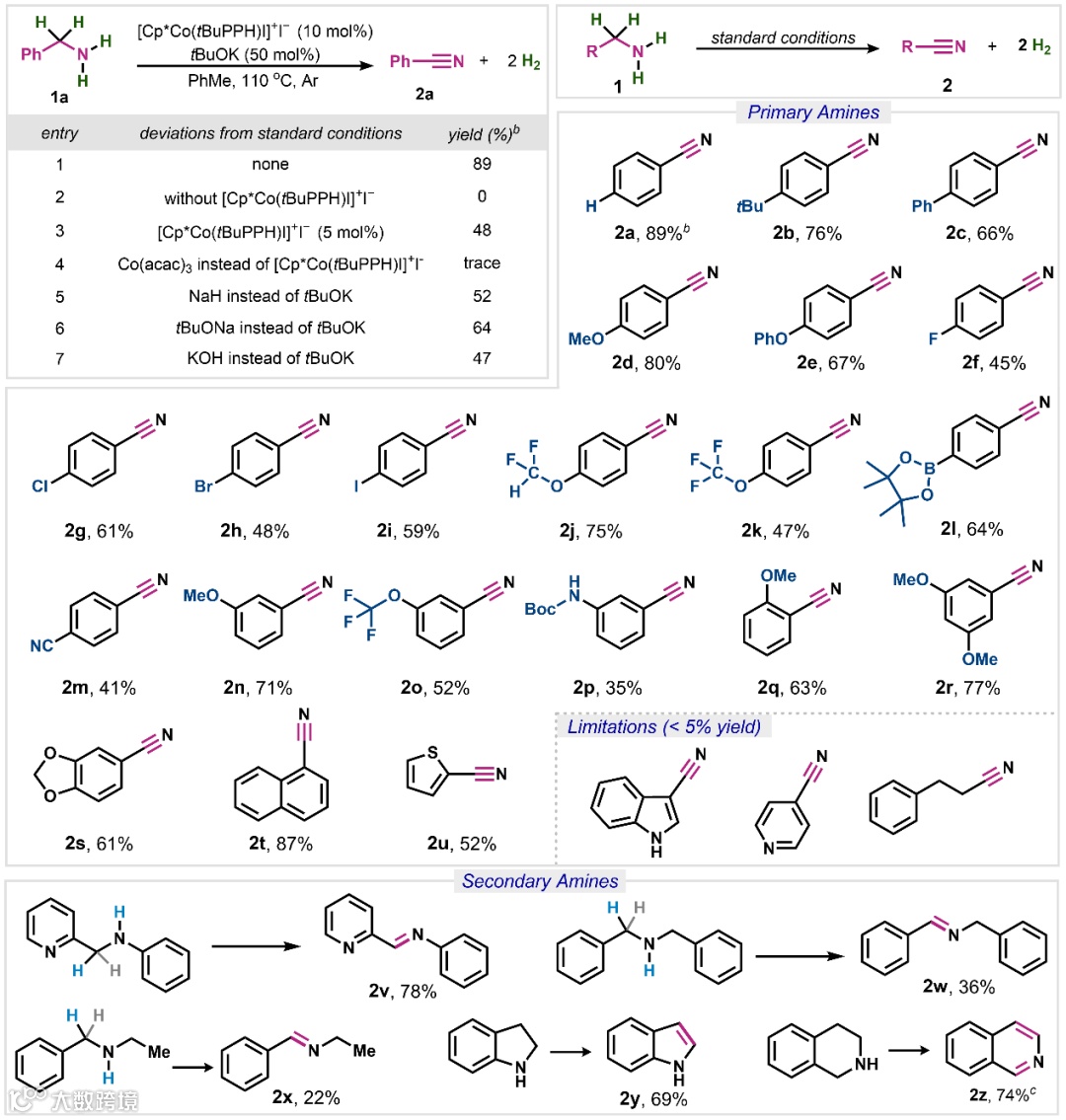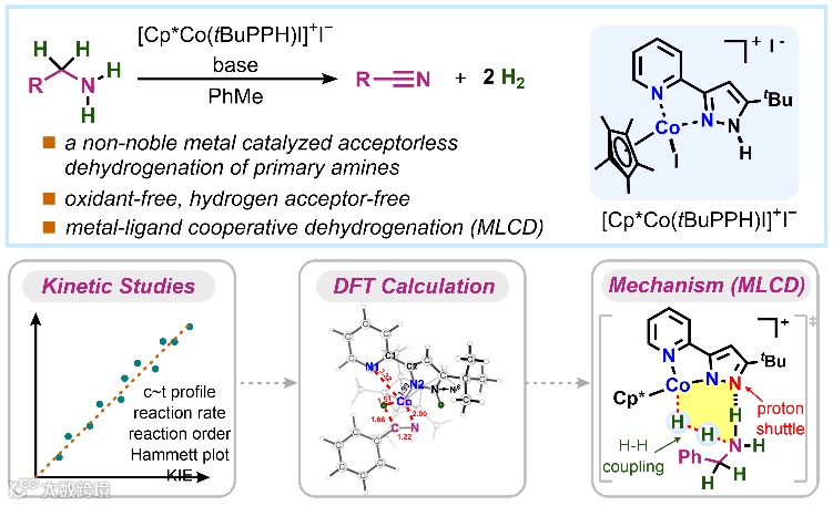 使用钴催化剂与N,N‒双齿配体,成功实现了一级胺在没有氧化剂和氢受体的情况下直接双脱氢生成腈