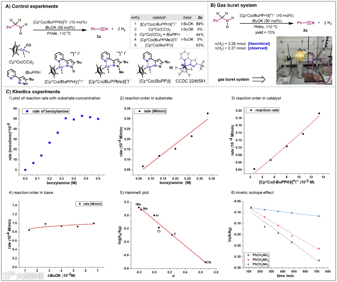 作者通过控制实验、气体收集实验、动力学实验对反应机制进行了仔细的实验研究。控制实验(图3A)表明一级胺的脱氢需要金属和配体的协同作用,碱是钴催化剂的活化剂,脱掉一分子HI的催化剂是催化活性物种。作者还设计了氢气收集装置(图3B),几乎和理论产量等量的收集到了产生的氢气。在动力学实验中,作者为了保证实验数据的准确性,将反应