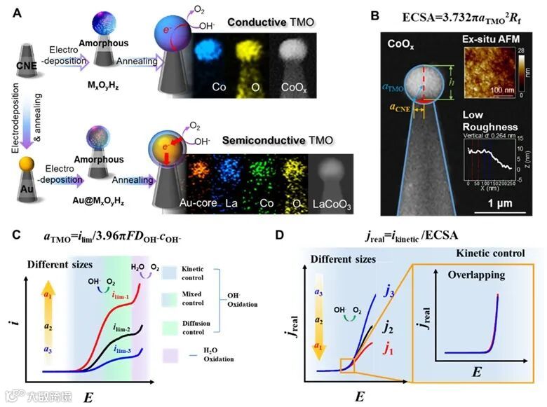 图1. 单颗粒纳米电极的构建及TMOs本征OER活性的精准测量。图片来源: