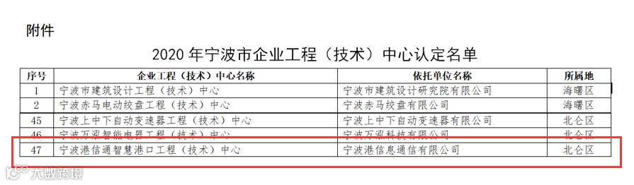 3月1日,从宁波市科学技术局获悉,信通公司申请组建的“智慧港口工程技术中心”顺利通过专家评审,被认定为“市级工程技术中心”。这是该公司继获得“国家高新技术企业”“区级工程技术中心”后取得的又一成果,成为集团内首家通过该资质认定的企业。