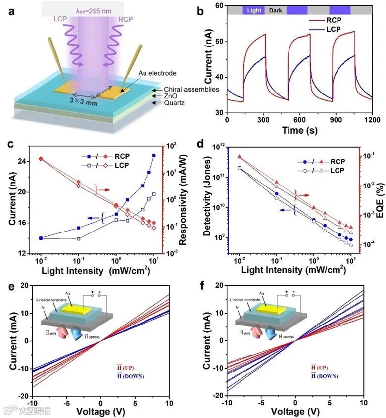 图5. 亚纳米手性组装体用于圆偏振光电检测器件