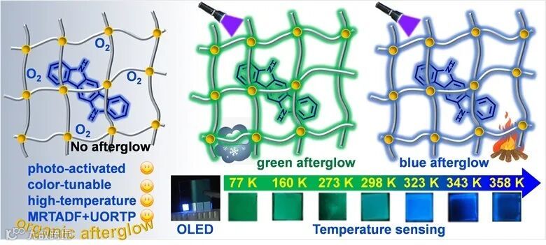 图1. 具有光激活特性的MRTADF加UORTP双模式颜色可调和高温有机长余辉。图片来源: