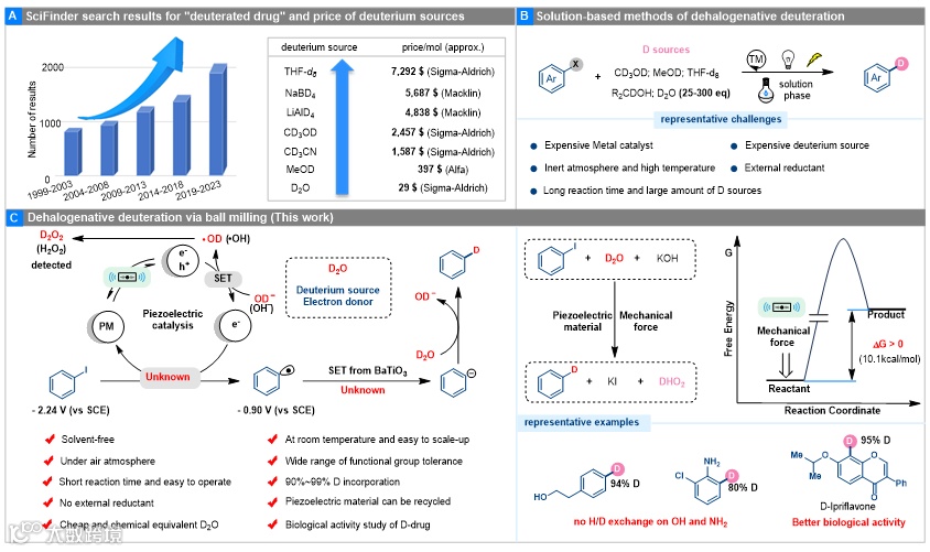 导读:四川大学练仲课题组开发了一种由压电材料BaTiO3催化的机械力诱导芳香碘化物的非自发脱卤氘化反应。