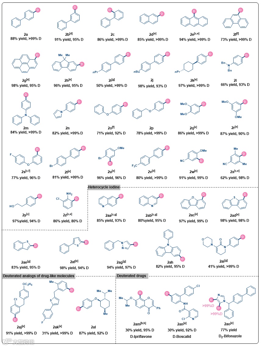 )。此外,在相同的反应条件下,不同的杂芳基碘化物得到了相应的产物,收率高,氘掺入率高(