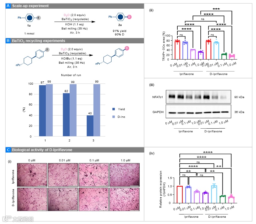 O 可实现高氘掺入;通过生物活性研究表明氘化修饰后的D-ipriflavone增强了体外对BMDMs破骨细胞分化的抑制作用。提供了一种温和、简便、绿色、高效的脱卤氘化途径(图1)。
