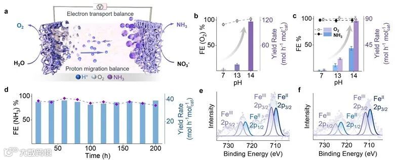 作者利用该电极成功实现了单个电解槽中电催化硝酸盐还原和水氧化的耦合反应,从而能够高效且高稳定性地合成氨和氧气。同时通过控制实验和理论计算的结合,为该体系优异的催化表现来源提供了可靠的依据。