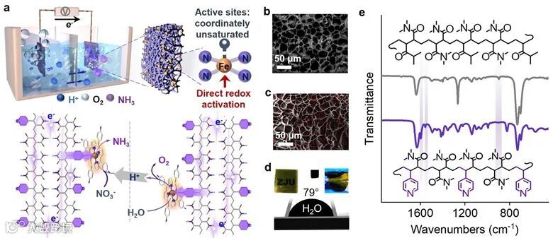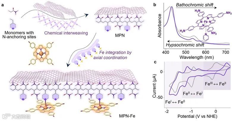 利用可逆轴向配位键将铁卟啉自组装到共价分子网络中,成功合成了稳定的铁基单位点催化电极。