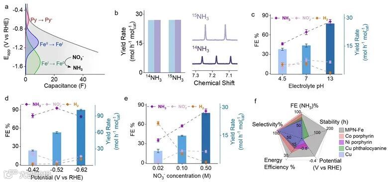 作者发现,催化实验测试结果显示出明显的pH依赖性。结合对催化剂的电化学分析发现,在强碱性的电解质条件下,有助于施加更负的绝对电位,促使吡啶和铁之间的配位键断裂,有效地暴露出不饱和配位的铁位点,激活催化活性中心。经过电化学活化后,该催化剂展现出优异的性能,能够有效吸附硝酸根从而高效地合成氨。其法拉第效率可达97%,并且具备至少200小时的稳定性。与之前报道的分子体系相比,该体系在多方面表现出优异的催化活性,这得益于不饱和金属位点的充分暴露。
