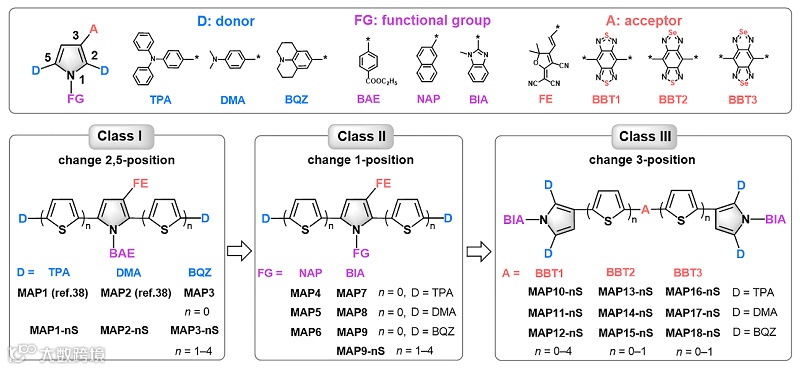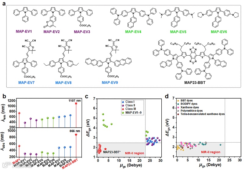 鉴于此,北京理工大学郑小燕副教授和石建兵副教授与美国宾夕法尼亚大学Joseph S. Francisco教授合作,采用“聚集诱导发光(AIE)分子设计-量化计算-特征描述符筛选-实验验证”的研究思路,以多芳基吡咯(MAPs)荧光分子为模板,通过改变取代基类型、位置、数量等设计了62个具有AIE特性的给体-受体型(D-A)分子(图1),系统的量化计算表明,所设计的MAPs分子的光谱跨越可见光区到NIR-II区整个光谱范围,并基于此提出了表征NIR-II荧光染料的两个关键描述符—ΔEgs(基态前线轨道能隙)和μgs(基态电偶极矩)。进一步拓展计算,表明这两个关键描述符不仅适用于MAPs类荧光染料分子,也适用于国内外已报道的其它非MAPs类的NIR-II荧光染料分子,具有很好的普适性。与此同时,通过实验对10个MAPs进行了实验吸收和发射光谱的测试,结果表明这些MAPs的光谱范围与理论预测完全一致,其中MAP23-BBT具有NIR-II发射,并表现出高空间分辨率的血管成像性能,证实了该策略的有效性,为开发新型NIR-II荧光染料分子提供了一个提前预判的有效工具。