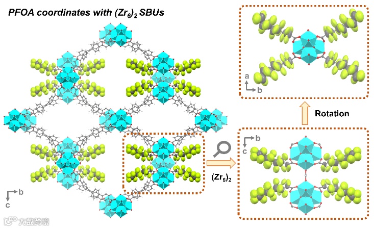 PFOA@PCN-999的单晶结构分析显示,PFOA通过其末端羧基与PCN-999中独特的(Zr6)2簇配位,并分布于介孔孔道内(图2)。计算结果也表明(Zr6)2簇为PFOA提供了额外的配位点,配位PFOAs进一步增强了与游离PFOAs之间的相互作用,从而显著提高了材料的吸附能力。总体而言,该研究成果不仅为额外的开放配位位点在提高 PFOA 吸附能力方面发挥的关键作用提供了明确的证据,而且增强了研究者对基于 MOF 的 PFOA 吸附机制的基本理解。因此,PCN-999的成功合成和优异性能为解决PFASs类污染物带来了新的希望,也为环境污染治理领域的研究提供了重要的参考和借鉴。