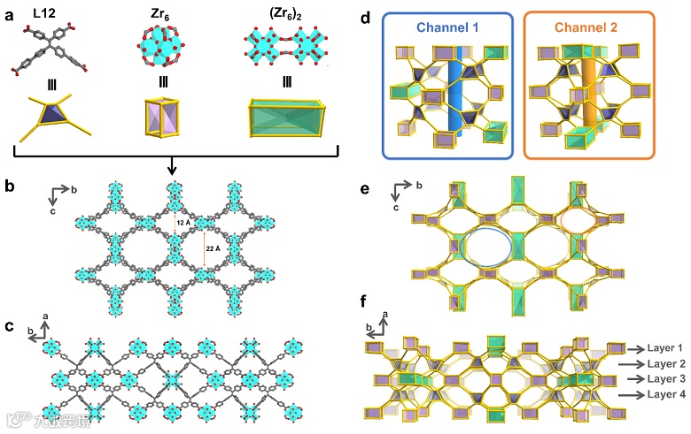 图1.(a)有机配体L12和两种金属簇结构。沿(b)a轴和(c)c轴的结构堆积图。(d, e, f)拓扑结构示意图。C、O和Zr原子分别由灰色、红色和青色表示。