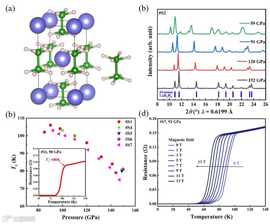 自上世纪初发现超导现象以来,寻找高温超导材料一直是人们不断追求的目标。近年来,氢基超导体的理论和实验研究被广泛开展。在2014年,研究者发现H3S在高压下的超导转变温度(Tc)可达到203 K,打破此前铜氧化物保持的纪录。随后,2019年,美国和德国的两个研究组分别独立报道了LaH10具有高达250-260 K的接近室温的Tc,再一次刷新记录。然而,拥有高Tc的富氢化合物都必须要超过百万大气压的超高压条件才能稳定,这极大的限制了此类超导材料的应用,能否制备出同时拥有高Tc和在较低压力下稳定的氢化物,是目前氢化物超导材料研究的重要挑战之一。