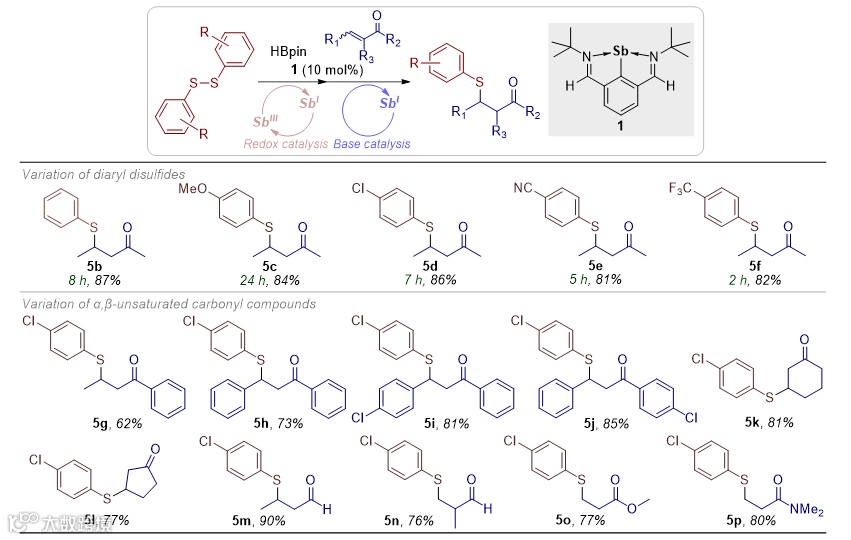 +1价锑宾可以与二硫醚发生氧化反应生成+3价有机锑化合物,该氧化产物可以被频那醇硼烷还原再生+1价锑宾。由此,锑宾可以催化二硫醚硼氢化反应。机理研究表明,该反应经历氧化加成、配体复分解、还原消除等过程,构建了一种独特的Sb(I)/Sb(III)变价催化循环(图1c)。二硫醚硼氢化产物硫醇和硫醇基硼酸酯可以与α,β-不饱和羰基化合物发生反应,一锅法生成β-硫醇基羰基化合物。机理研究表明,该反应中锑宾作为碱催化剂促进了硫醇的Michael加成反应。该一锅法有机合成方法可以应用于中多种多样的β-硫醇基羰基化合物的制备,锑宾先后作为变价催化剂和碱催化剂参与反应,展现了锑催化剂的有效性和多样性(图2)。