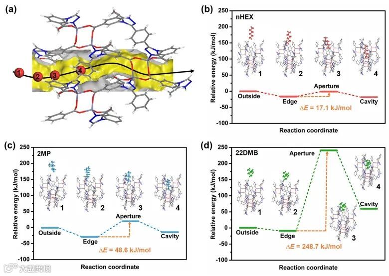 研究人员通过密度泛函理论 (DFT) 计算了己烷异构体扩散到通道中的能垒。结果表明,nHEX和2MP的能垒分别为17.1 kJ/ mol和48.6 kJ /mol,表明它们能够快速扩散到通道中。相比之下,22DMB 的能垒高达248.7 kJ/ mol,表明 22DMB 在通道中的扩散极其困难。这与实验吸附数据一致,进一步证实了JNU-80-NP能够通过尺寸排阻机制筛分双支链己烷异构体。