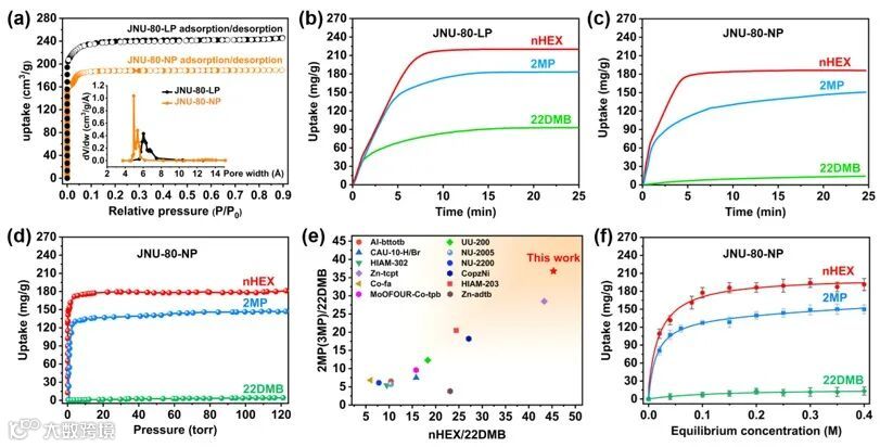 吸附/解吸等温线;(b, c) 动力学吸附等温线;(d) 蒸汽吸附等温线;(e) MOF材料分离己烷异构体的性能比较;(f) 液相吸附等温线