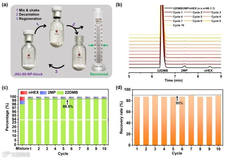 为了实际应用考虑,研究人员制备了MOF聚合物复合材料(JNU-80-NP-block),并探究了其在室温下从22DMB/2MP/nHEX(v:v:v = 98:1:1)三元混合物中一步纯化22DMB的能力。研究表明,JNU-80-NP-block可以高效地移除己烷混合物中的nHEX和2MP,通过简单的液相吸附即可获得高纯度的22DMB。在连续十次液相吸附循环中,22DMB的纯度均可达99.5%,回收率接近90%。