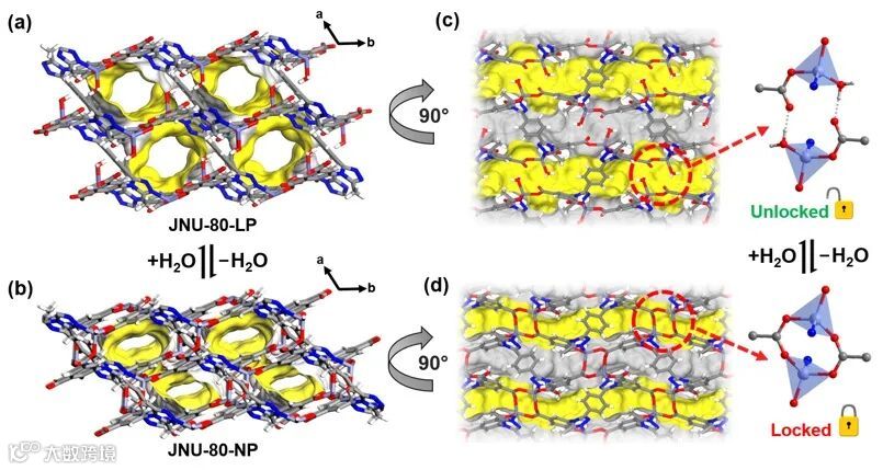 一种新型的MOF材料(JNU-80),能够实现在大孔相(JNU-80-LP)和窄孔相(JNU-80-NP)之间可逆的SCSC结构转变。
