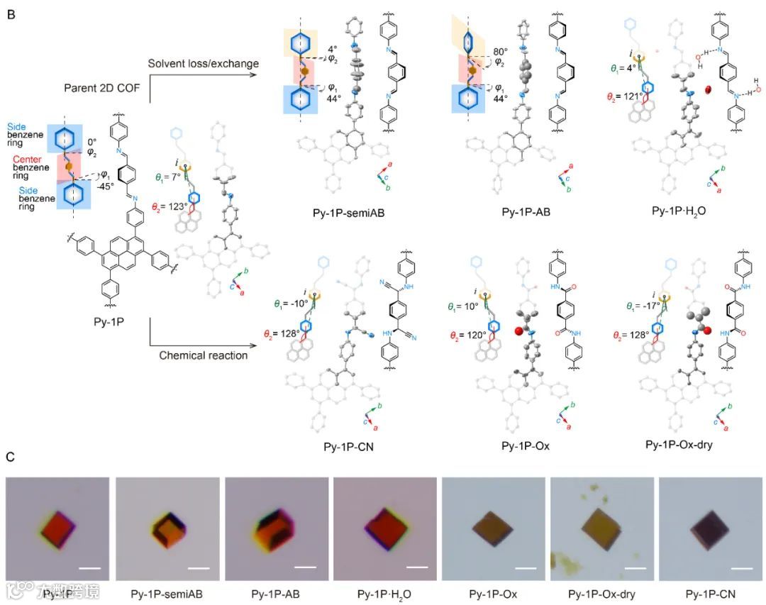 2.首次解析了经过化学转化后的2D COF单晶结构,揭示了合成后修饰对2D COF分子构象、层间堆积和窗口形状的影响;