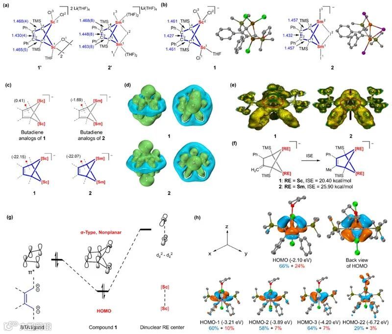以上研究阐明了这种非平面芳香性的来源,而这也是富电子的2-丁烯烯四阴离子配体得以稳定存在的根源。基于此,他们预测可能存在其他非平面芳香性稀土金属杂环,因此,利用DFT计算优化出了镥和钆的双核稀土金属杂环结构(图3a)。这两个分子同样具有平均化的键长,且表现出明显的芳香性特征,其电子结构与钪和钐杂环分子基本一致,同样存在5c-6e共轭体系(图3b-e)。