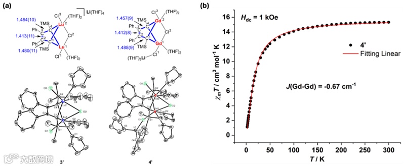 基于DFT计算结果,他们不断尝试并最终合成了预测的双核镥和钆杂环。X-射线单晶衍射分析表明这两个杂环均存在键长平均化,与DFT计算的键长保持一致(图4a)。考虑到双核钆芳香杂环中存在未配对的4f电子,为了确定其基态,对其进行了变温磁化率分析,结果表明两个三价钆离子之间存在反铁磁耦合作用(