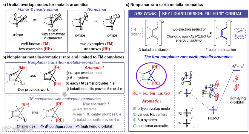 图1. 金属杂环的p-d轨道重叠模式、非平面芳香过渡金属杂环及非平面芳香稀土金属杂环的合成