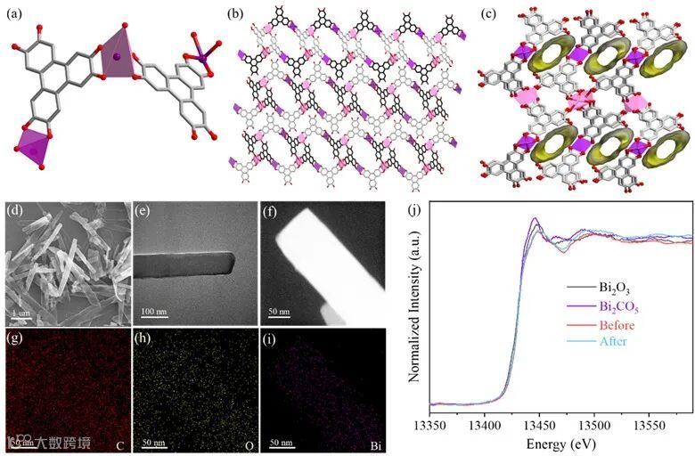的三维π-π堆叠结构,沿b轴方向有一维孔隙。(d) SEM图像。(e) TEM图像。(f) HADFF-TEM图像。(g-i) EDX元素映射图像。(j)