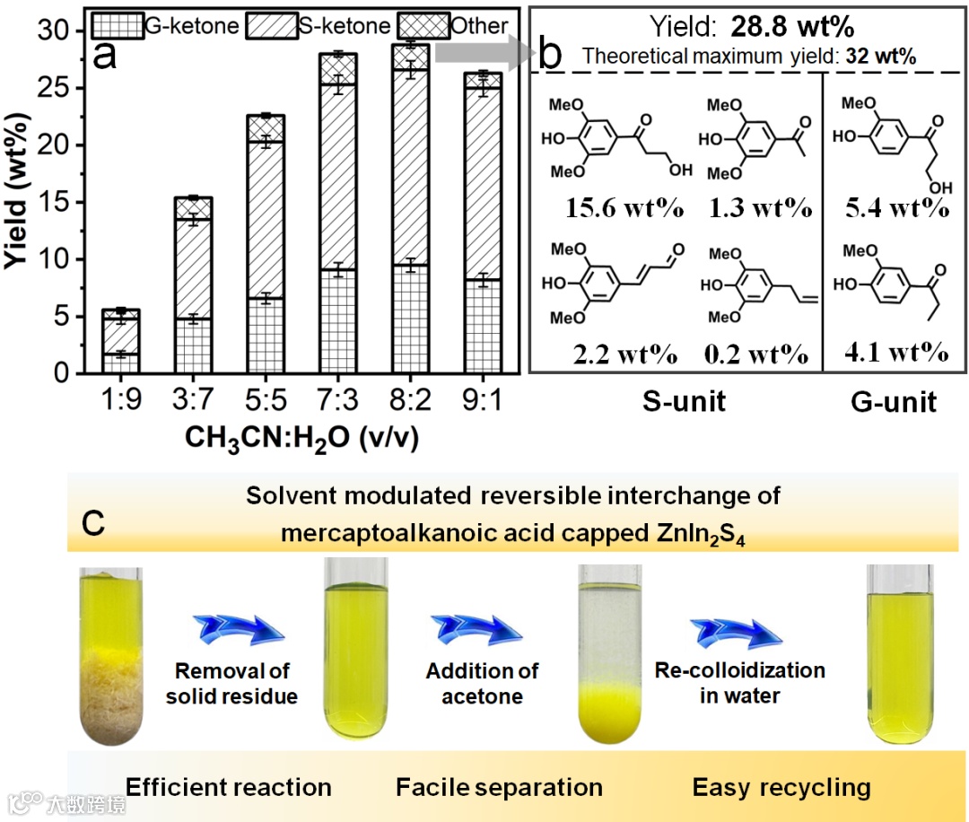 O(v/v = 8:2)的混合溶剂中解聚桦木粉所得官能化芳香化合物;(c)通过溶剂调控ZIS-MPA在胶状和聚合状之间可逆转变的照片。图片来源: