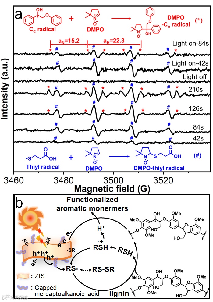 分布的DMPO 自旋捕获ESR谱图;(b)可见光驱动以巯基烷酸为配体的超薄ZIS 微米带将桦木粉中原生木质素转化生成功能化芳香化合物的反应机制。图片来源: