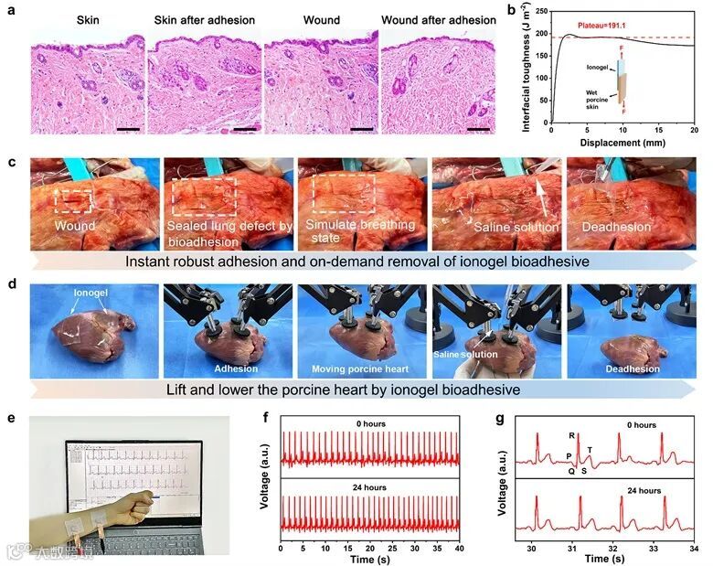 ),与玻璃基底的粘附强度高达24.4 MPa。此外,离子凝胶可在湿生物组织界面形成机械匹配的坚韧粘附(界面韧性约为191 J