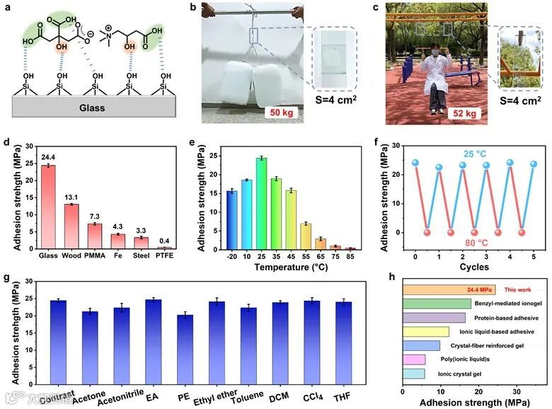 的玻璃片能够提起50 kg的水桶或约52 kg的成年人。在室温下,离子凝胶对玻璃、木材、PMMA、Fe和不锈钢的平均粘附强度分别为24.4、13.1、7.3、4.3和3.3 MPa(粘附24 h,粘附面积为0.15 c