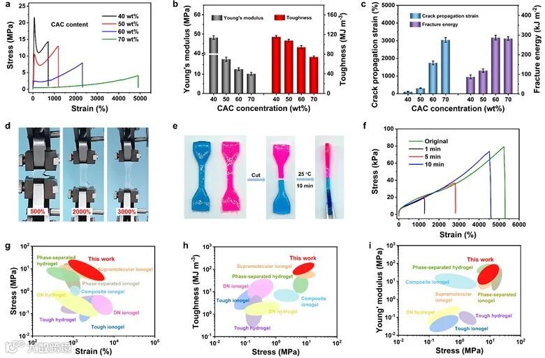 )和杨氏模量(48 MPa)超过了报道的韧性水凝胶/离子凝胶、双网络水凝胶/离子凝胶、相分离水凝胶/离子凝胶、复合离子凝胶,和超分子离子凝胶。