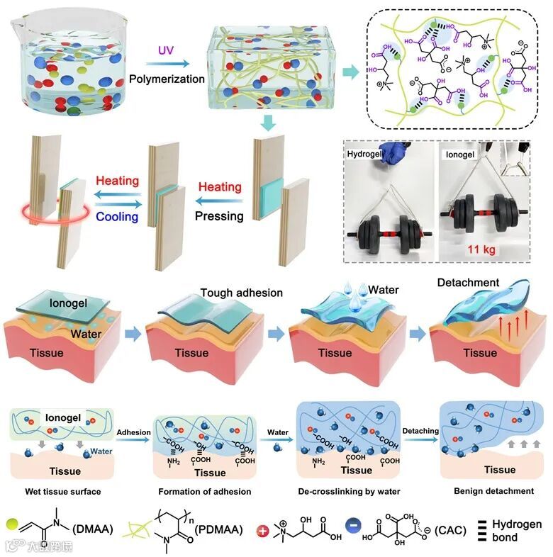 柠檬酸/L-(-)-肉碱(CAC)基离子液体作为溶剂来制备高强度、高粘附强度的离子凝胶,用于可逆的工程和生物粘合剂,克服了界面能和内聚能之间的矛盾