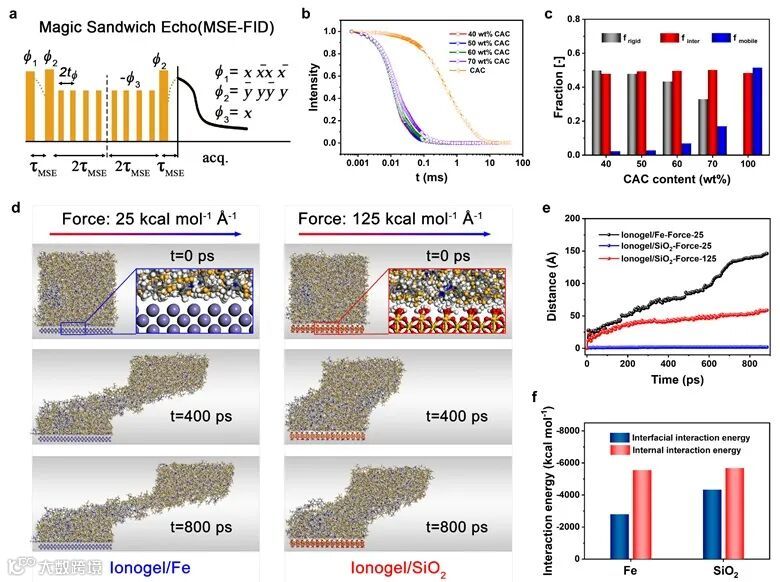 低场固体核磁共振谱被用来解释聚合物的原位片段动力学。通过低场核磁表征手段得到离子凝胶的自由感应衰变信号,然后通过相应的函数拟合得到各组分的弛豫