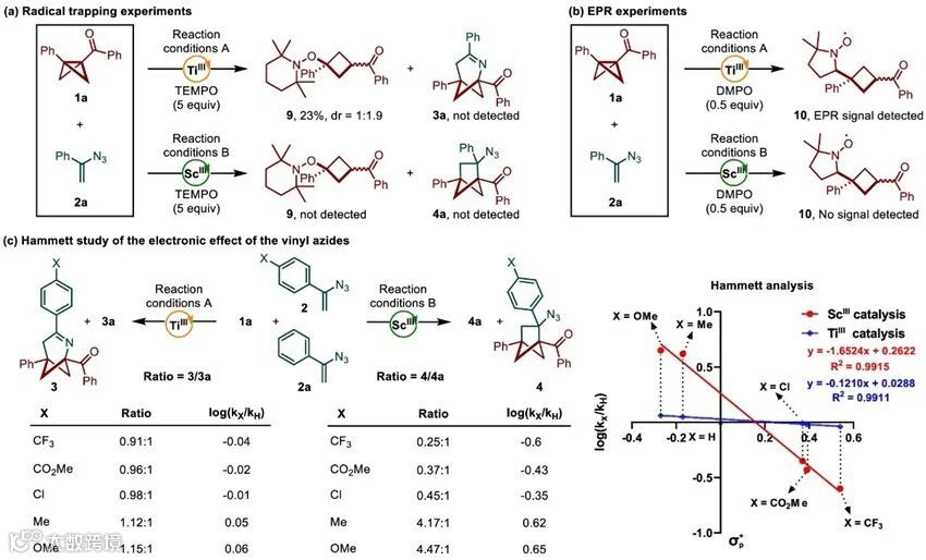 实验和Hammett曲线分析等机理研究表明钛催化体系是经历了自由基历程,而钪催化体系则更倾向于离子型的机理(图6)。