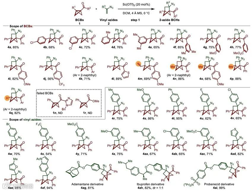 并不适用于该催化,作者推测是由于它们形成的环丁基自由基稳定性较差。除苯基酮外,2-萘基、噻吩基、2-溴噻吩基和咪唑基等芳香族BCB酮类也可兼容该反应。对α-烯基叠氮化物的底物范围进行拓展,发现该反应可以兼容药物化学中常见的官能团,如氟、氯、溴、三氟甲基和酯。此外,由金刚烷、布洛芬、丙磺舒衍生的α-烯基叠氮化物也能高效地转化为相应的产物。