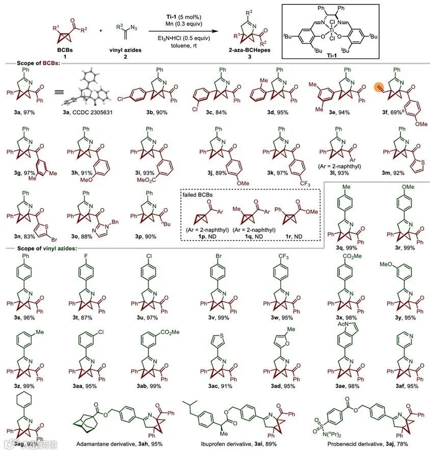 N•HCl (0.5 equiv)为添加剂。随后对Ti(salen)催化体系的底物范围进行了考察(图2)。总体而言,一系列BCB酮可与α-烯基叠氮化物