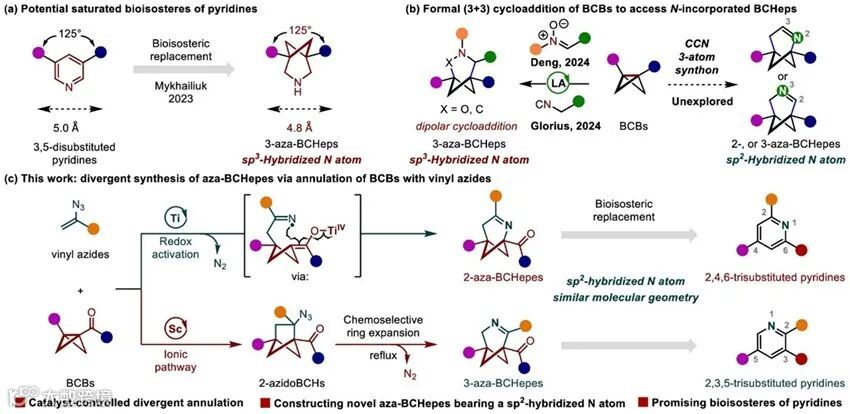 催化剂调控的双环[1.1.0]丁烷与α-烯叠氮化物的环化反应,发散性地合成了2-和3-氮杂双环[3.1.1]庚烯 (aza-BCHepes)