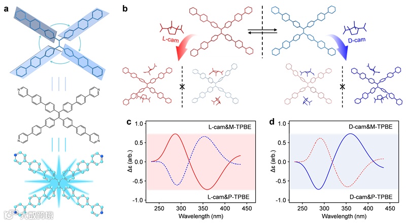 的TPBE微晶,进一步利用分子扩散的方法将手性Cam引入到了主体TPBE的框架结构中(图2)。手性Cam分子的引入诱导了TPBE分子构象的变化,有望产生优异的手性光学活性。