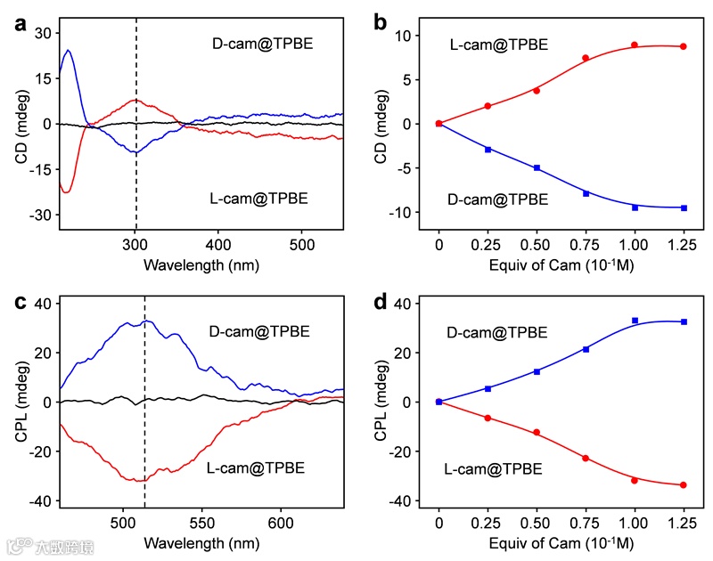 手性Cam掺杂的TPBE(Cam@TPBE)微晶展现出优异的适应性手性光学活性(图3)。一对Cam对映体(L-Cam和D-cam)可以诱导出镜像对称的圆二色(CD)光谱和圆偏振发光(CPL)光谱,并且Cam@TPBE微晶的手性光学活性随Cam浓度增加。