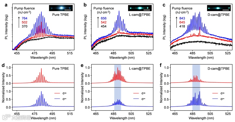 最终,得益于手性超分子微晶的适应性螺旋手性与优异受激辐射性能的有效耦合,L-Cam和D-Cam掺杂的TPBE微晶实现了相反手性的圆偏振激光出射,其不对称系数高达~ 0.7(图4)。
