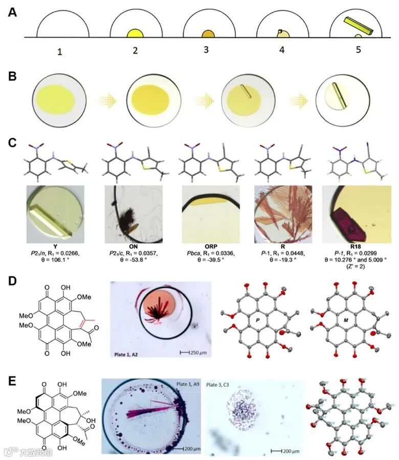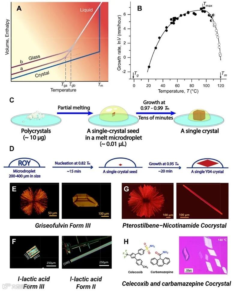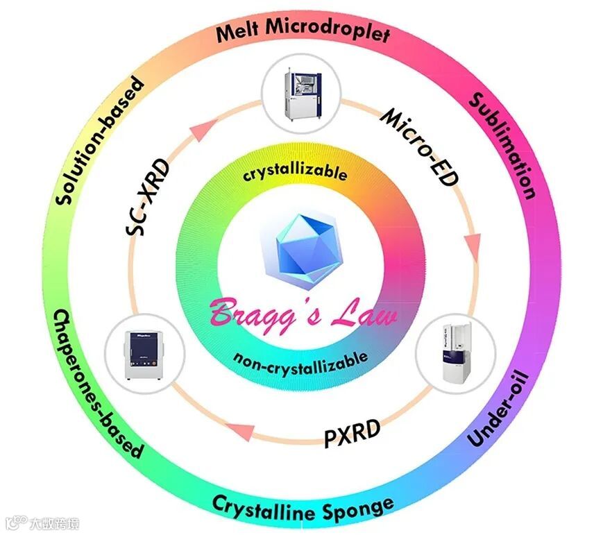 的严格要求。本综述讨论了获取单晶结构的先进设备和理论技术,包括SCXRD、PXRD、PXRD与CSP、PXRD与NMR,以及微电子衍射(Micro-ED)。此外,还深入探讨了基于三种基础方法的结晶技术:溶液结晶、熔融结晶和升华结晶。本文对分子结晶能力及晶体生长方法的优化进行了详细讨论。对于可结晶的分析物,通过结合晶体生长增强技术高通量技术(封装纳米液滴结晶与油下结晶法),可以弥补在常规条件下的结晶性差、尺寸小和缺陷问题。对于原则上难以结晶的分子,可以使用“晶体海绵”如金属有机框架(MOFs)或者“共结晶伴侣”如四芳基金刚烷来实现共同结晶,从而确定其绝对构型。