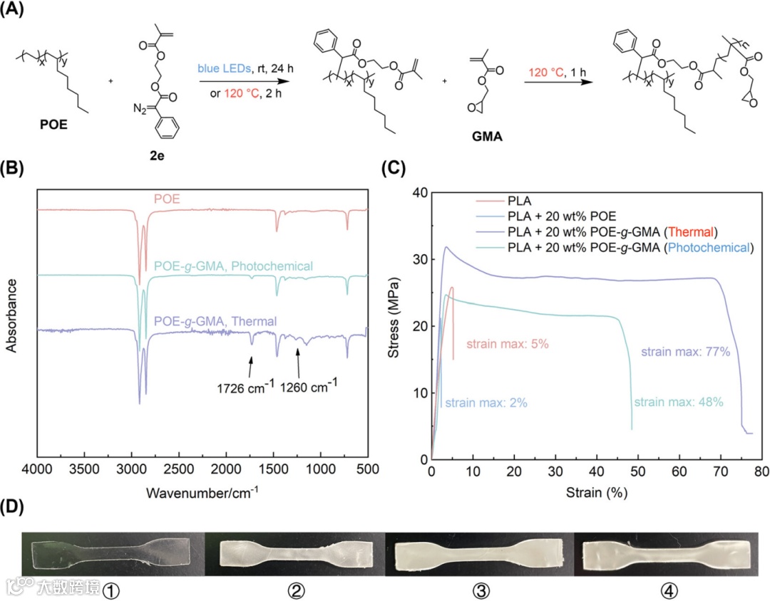 作者使用2e与甲基丙烯酸缩水甘油酯(GMA),通过两步法对聚烯烃弹性体(POE)进行了环氧修饰(图2A)。聚合物红外谱图出现的1726与1260 cm-1信号分别对应2e中的酯基与GMA中的环氧基团(图2B)。将修饰后的POE与聚乳酸(PLA)进行共混,材料的断裂伸长率提高到了48%与77%(图2C),证明环氧修饰后的POE(POE-g-GMA)对PLA的增韧效果明显。