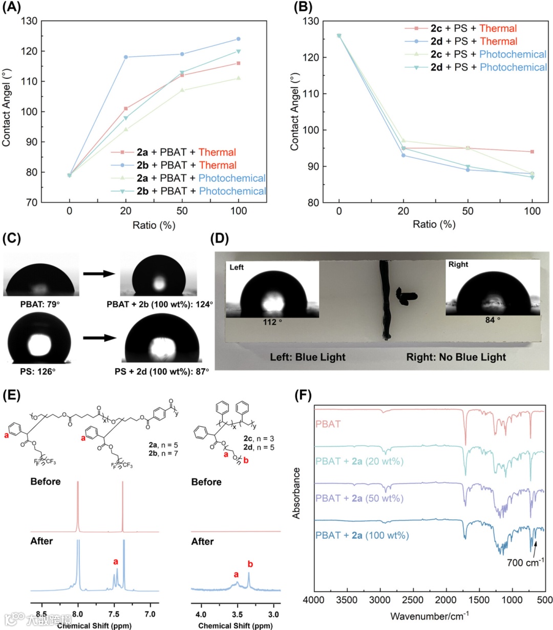 作者分别在光与热的活化条件下对聚合物进行了亲疏水性的改性。在光活化的条件下,通过含有全氟烷基链的2a与2b的修饰,聚己二酸丁二酸酯-对苯二甲酸丁二醇酯(PBAT)的静态接触角从79°分别提高到了111°与120°(图1A);而通过含有聚乙二醇链的2c与2d的修饰,聚苯乙烯(PS)的静态接触角从126°降低到了88°与87°(图1B)。在热活化的条件下,PBAT的静态接触角从79°提高到了116°和124°;PS的静态接触角也从126°降低到了94°与88°。在对修饰后的聚合物进行核磁(图1E)与红外(图1F)的表征中,均出现了与重氮修饰相对应的新的信号,证明修饰成功完成。
