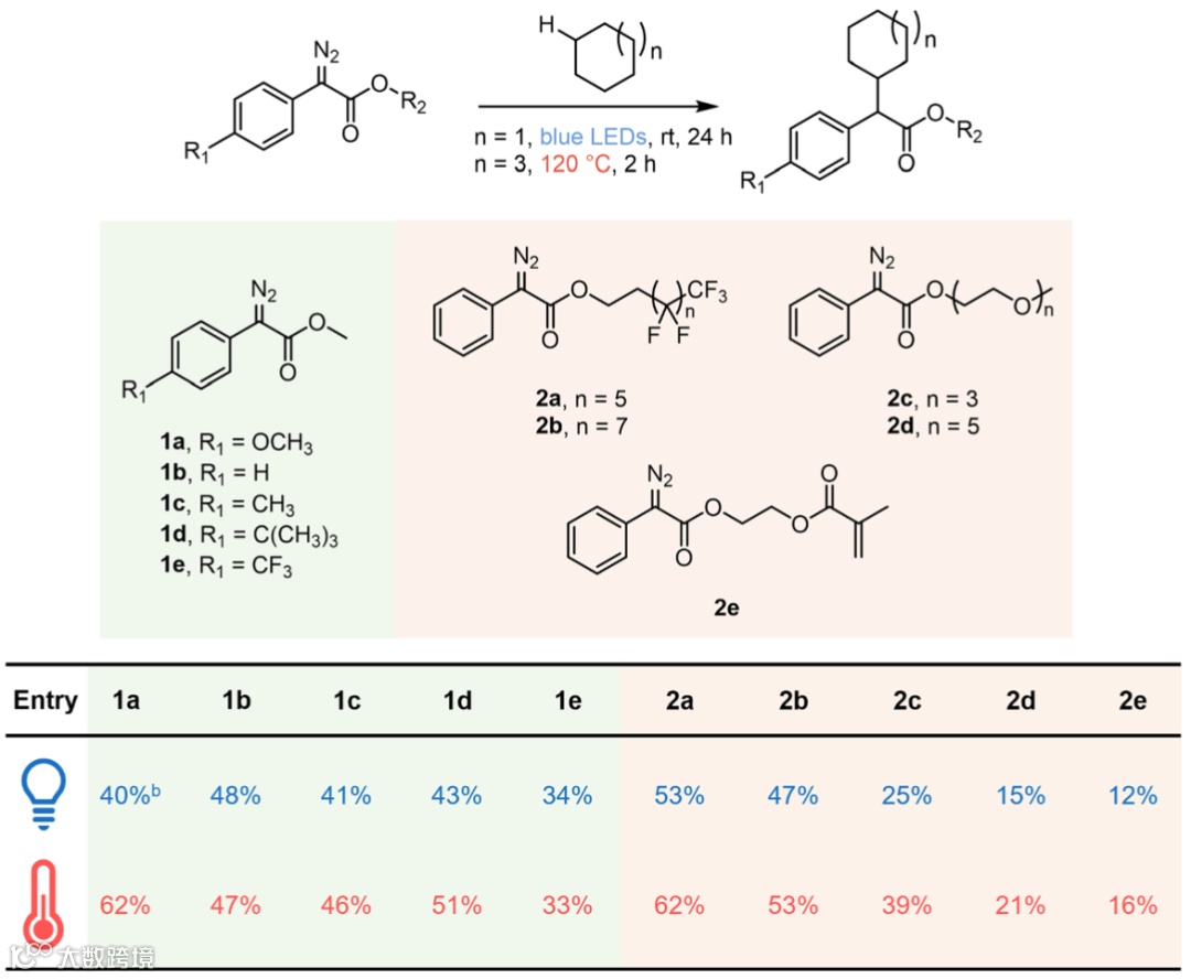 作者通过模型反应,探究了不同结构重氮化合物的C−H键插入效率。作者通过对模型反应的产物进行分离并计算产率,以此来衡量插入效率。对于苯环连接不同取代基的重氮化合物,在蓝光活化的条件下,苯环上没有取代基的1b表现出了最高的插入效率(48%),而取代基的引入则会降低插入的效率(1a 40%,1c 41%,1d 43%,1e 34%)。在热活化的条件下,苯环连接取代基的电子效应会明显影响重氮化合物的插入效率,对于电子效应并不明显的1b、1c和1d,它们的插入效率在40-50%之间,含有甲氧基的1a的插入效率达到了62%,而含有三氟甲基的1e则降低至了33%。
