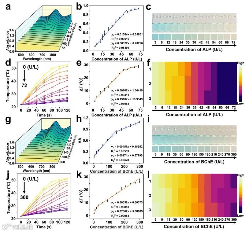 体系随ALP和BChE浓度增加的比色响应信号(ALP: a−c; BChE: g−i)和光热响应信号(ALP: d−f; BChE: j−l)